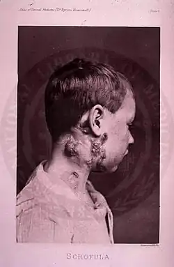 - ^ a b Scrofolosi (pop. detta scrofula), in Dizionario di medicina, Roma, Istituto dell'Enciclopedia Italiana, 2010. URL consultato il 21 aprile 2021.«scrofolosi (pop. detta scrofula) Linfadenite cervicale, ad andamento cronico, per lo più di natura tubercolare, secondaria generalmente a un focolaio primitivo situato nel distretto orofaringeo (tonsille, gengive, ecc.). La malattia, che colpisce prevalentemente bambini malnutriti e in cattive condizioni igieniche, si manifesta con tumefazione dei linfonodi laterocervicali, che progressivamente colliquano, si ulcerano, danno luogo a emissione di materiale caseoso, risolvendosi poi in cicatrici retrattili. La terapia è antibiotica (antitubercolare), chirurgica in casi selezionati»