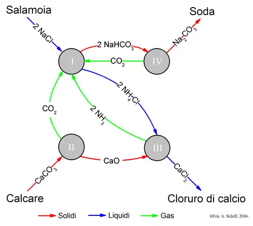 Le nozioni scientifiche alla base del nuovo processo erano note fin dagli anni 1820: se in una soluzione di sale saturata con ammoniaca veniva fatta gorgogliare anidride carbonica, si otteneva un precipitato di bicarbonato di sodio, poco solubile, da cui per riscaldamento si aveva facilmente la sospirata soda. Il metodo nella pratica aveva posto problemi di ingegneria insuperabili, fin quando nelle mani di Ernest Solvay e del fratello Alfred - dopo anni di tentativi - era diventato praticabile. Il passo decisivo era stato compiuto con la messa a punto di una particolare torre di carbonatazione; ulteriori perfezionamenti si ebbero nei forni per la produzione dell'anidride carbonica e per la calcinazione del bicarbonato. La Société Solvay et Cie fu fondata nel 1863 e i diritti di produzione per l'Inghilterra furono acquistati da Ludwig Mond nel 1872.