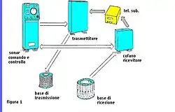 Come si vede dalle frecce grigie il telefono subacqueo riceve i segnali esterni dal cofano collegato alla base acustica del sonar, successivamente, dopo l'ascolto, invia il segnale telefonico di risposta direttamente al cofano trasmettitore che lo trasferisce alla base di emissione del sonar.