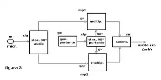 Infine il sommatore (sm) riceve i due segnali dall'uscita da (mp1) e (mp2) e rende il segnale voluto indicato genericamente con ssb; detto segnale, se rappresenta la parte più alta dello spettro, è indicato come usb, se rappresenta la parte inferiore dello spettro è indicato come lsb.