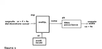 Il segnale sr = f + fo ( somma della portante f e del segnale telefonico fo), captato dalla base ricevente del sonar, è applicato a un ingresso del moltiplicatore (mp); moltiplicatore con cancellazione della frequenza dell'oscillatore locale; il secondo ingresso di (mp) riceve il segnale dall'oscillatore locale (ol). [N 6]