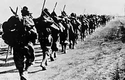 La seconda guerra mondiale vide gli alpini impegnati inizialmente sul confine francese durante la battaglia delle Alpi Occidentali del giugno 1940, dove quattro divisioni Alpine erano schierate in zona di guerra: la Taurinense schierata sul confine alla testa della Dora Baltea, la Tridentina in seconda linea nella stessa vallata, con alcuni battaglioni Alpini costituiti all'atto della mobilitazione; in riserva erano la Cuneense e la Pusteria, rispettivamente in valle Gesso e val Tanaro. Questi reparti furono inquadrati nel Gruppo d'armate Ovest forte di 315 000 uomini lungo tutto il confine[66].