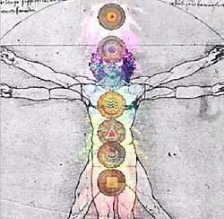 A partire dagli anni sessanta con la diffusione dei movimenti new Age si sono affermate diverse nozioni riguardanti l'aspetto e il significato dei sette chakra principali dell'essere umano, associati ad esempio rispettivamente a uno dei colori dell'iride. Ognuno di questi chakra ruoterebbe in un senso alternativo rispetto a quello precedente e a quello successivo situati lungo la linea verticale che va dalla testa all'addome. Il loro aspetto ricorda quello di un fiore perché presentano delle piccole protuberanze simili a dei petali, e sono suddivisi in tracce concentriche e settori longitudinali.