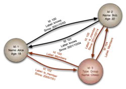 - Modello dei dati del grafo di Proprietà: modello di multigrafo diretto, etichettato, con attributi (proprietà) e con archi multipli tra i nodi (Neo4j, Sparksee/DEX, InfiniteGraph)[1]