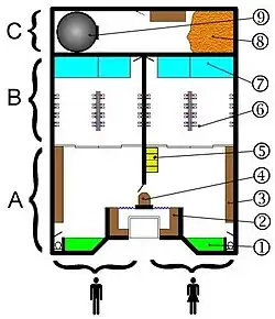 Nel retro dell'edificio si trova la stanza della caldaia (釜場?, kamaba), dove l'acqua diretta alle vasche viene riscaldata. Il carburante utilizzato varia da sentō a sentō: alcuni utilizzano l'elettricità, altri olio e altri ancora utilizzano trucioli di legno[35]. La temperatura dell'acqua si aggira solitamente sui 43 °C mentre, per quanto riguarda le vasche con acqua fredda, la temperatura è di 15 °C[36].